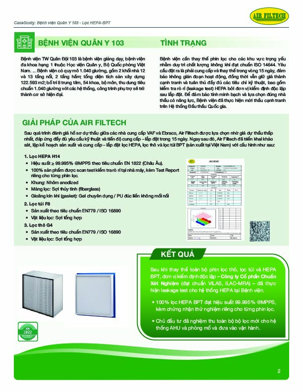 Sau quá trình đánh giá hồ sơ dự thầu giữa các nhà cung cấp VAF và Ebraco, Air Filtech được lựa chọn nhờ giá dự thầu thấp nhất, đáp ứng đầy đủ yêu cầu kỹ thuật và tiến độ cung cấp – lắp đặt trong 15 ngày. Ngay sau đó, Air Filtech đã triển khai khảo sát, lập kế hoạch sản xuất và cung cấp – lắp đặt lọc HEPA, lọc thô và lọc túi BPT (sản xuất tại Việt Nam) với cấu hình như sau: