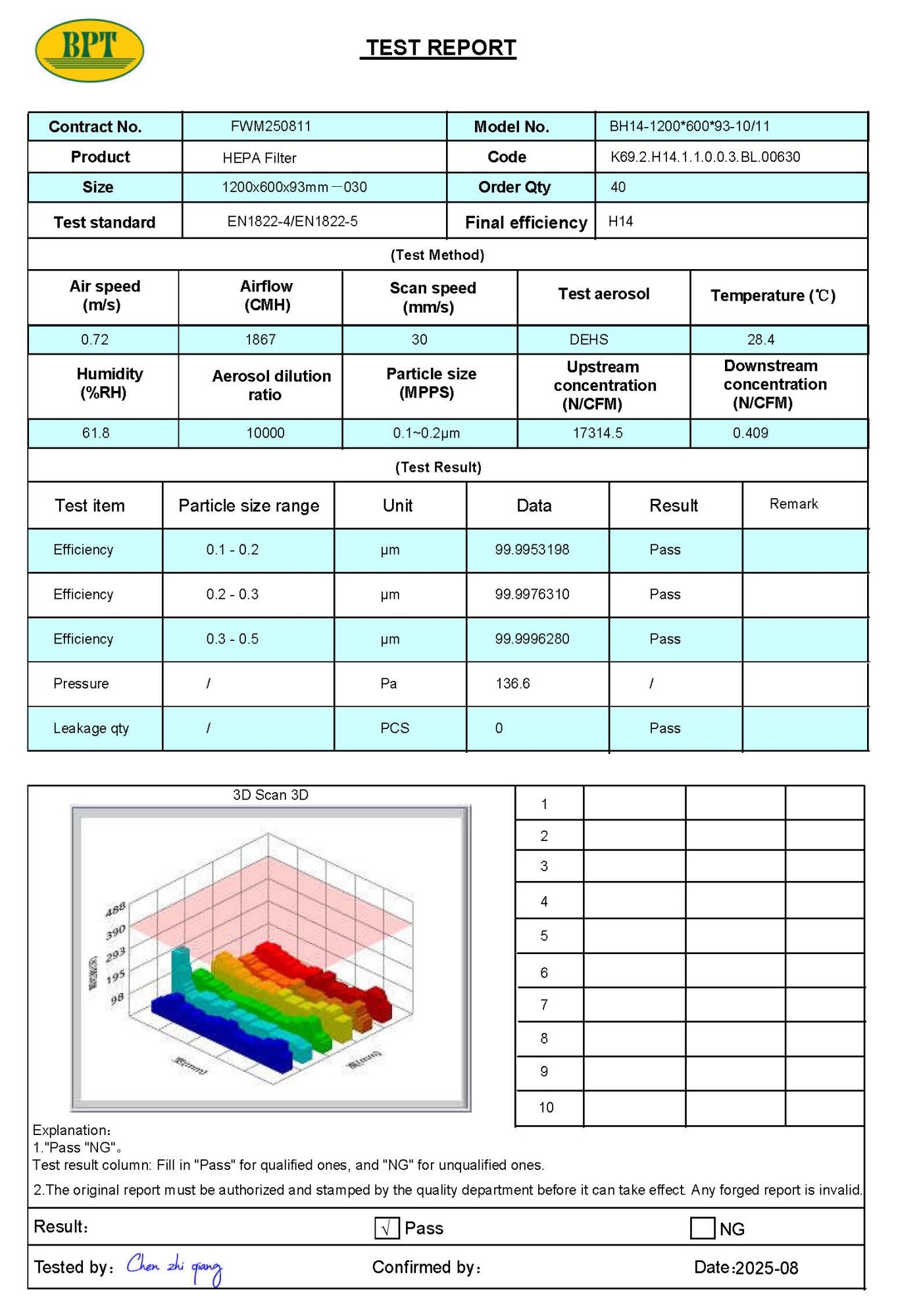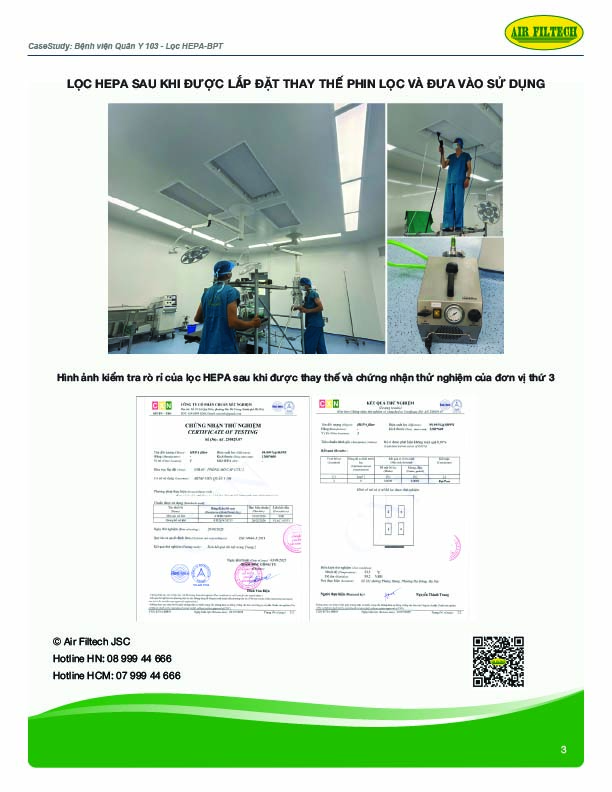 Sau khi thay thế toàn bộ phin lọc thô, lọc túi và HEPA BPT, đơn vị kiểm định độc lập – Công ty Cổ phần Chuẩn Xét Nghiệm (đạt chuẩn VILAS, ILAC-MRA) – đã thực hiện leakage test cho hệ thống HEPA tại Bệnh viện.