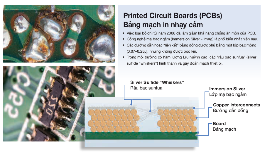 Các bảng mạch in (Printed Circuit Boards – PCB) thường sử dụng lớp mạ bạc (Immersion Silver): để tăng độ dẫn điện và giảm điện trở tiếp xúc. Tuy nhiên, trong môi trường có chứa khí sulfur hoặc hơi acid, bạc sẽ phản ứng tạo thành bạc sulfide (Ag₂S).